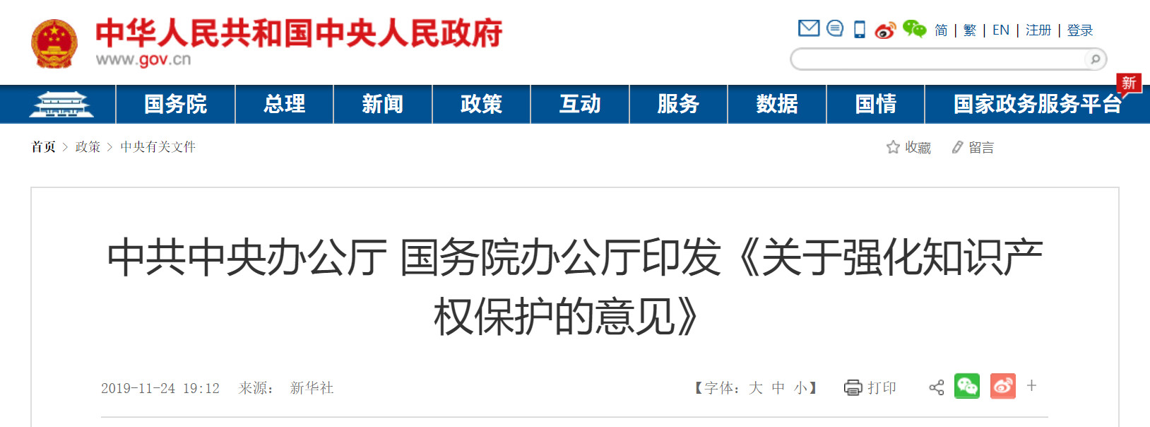 加強(qiáng)知識產(chǎn)權(quán)保護(hù),是完善產(chǎn)權(quán)保護(hù)制度最重要的內(nèi)容,也是提高我國經(jīng)濟(jì)競爭力的最大激勵(lì)。為貫徹落實(shí)黨中央、國務(wù)院關(guān)于強(qiáng)化知識產(chǎn)權(quán)保護(hù)的決策部署,進(jìn)一步完善制度、優(yōu)化機(jī)制,現(xiàn)提出如下意見。
