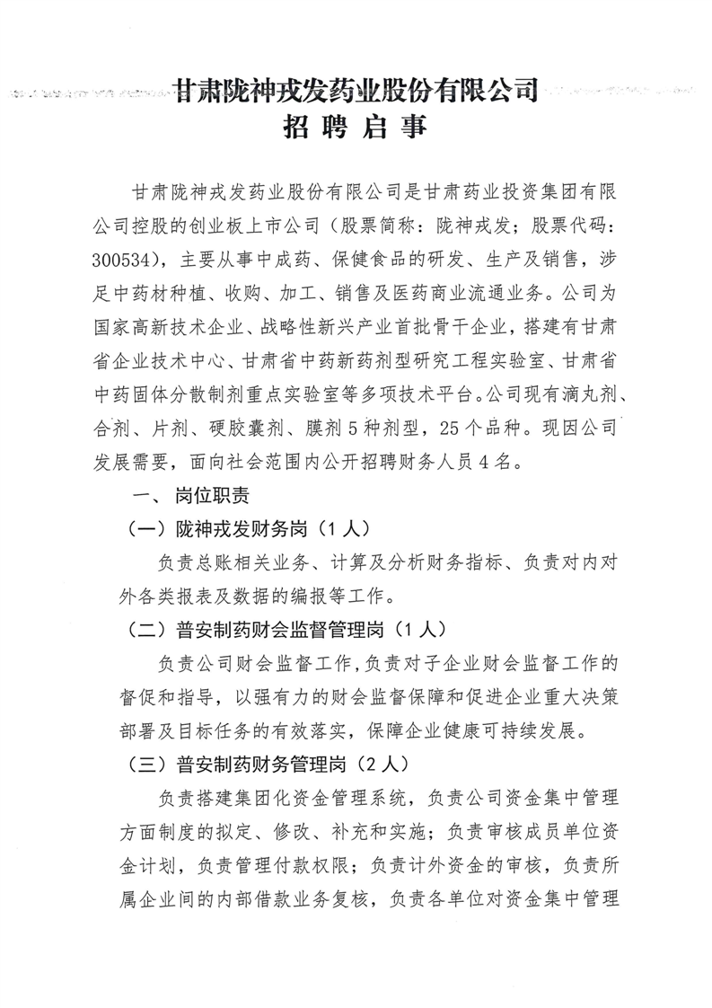 甘肅隴神戎發(fā)藥業(yè)股份有限公司招聘啟事